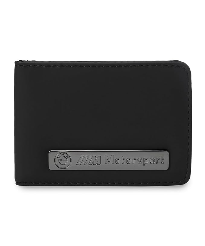 Product Story: Accelerate your drive in style with this BMW M Motorsport wallet. Flaunt the iconic BMW M metal logo as you charge down the motorway. Multiple card slots and a woven loop put your essentials within easy reach, so you can focus on the open road ahead. FEATURES & BENEFITS Made with at least 30% recycled materials.DETAILS Handy wallet with a stylish BMW M Motorsport metal logo on the front for a sporty and sophisticated look Multiple card holders for easy organisation and storage of your cards Contrast BMW M colour woven loop on the back and printed Puma logo on the inside adds a touch of style and uniqueness Made with high-quality materials including polyurethane shell, nylon mesh, and polyester lining for durability and longevity Dimensions: 20.5 x 0.3 x 7 cm